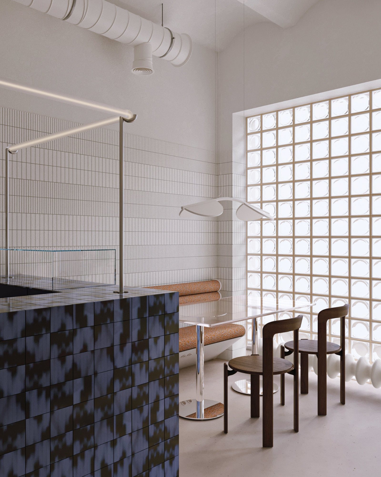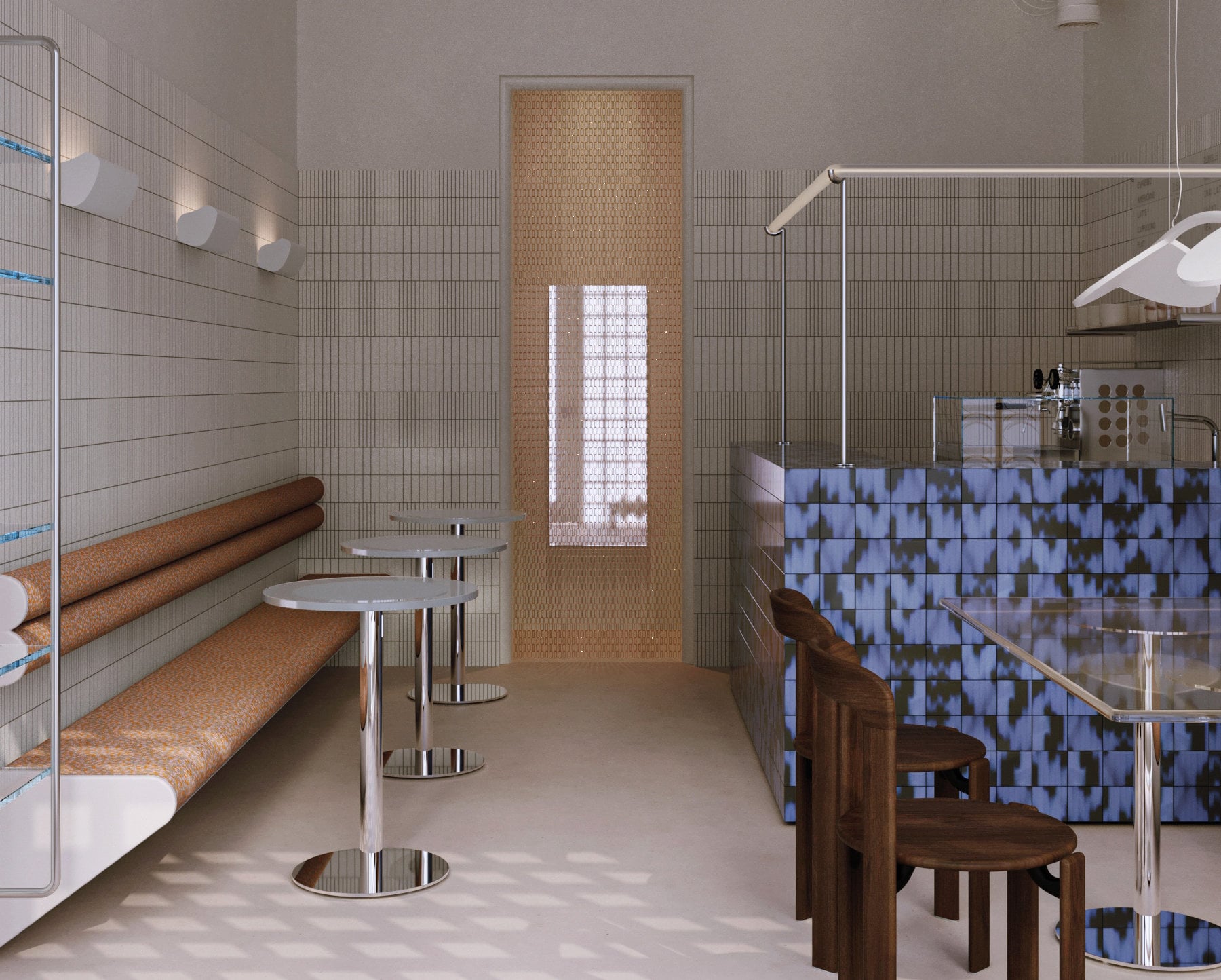 An den Wänden wurden Bänke installiert. Gegenüber des Barista-Tresens stehen drei runde Bistrotische für bis zu sechs Gäste. Daneben empfängt ein großer Glastisch Gruppen von bis zu vier Personen. Korpaleva hat den Raum mit seinen Gewölbedecken wie einen White Cube behandelt und ihn zunächst konsequent weiß grundiert. Anschließend zogen Farben und Texturen ein, die den Raum nun zonieren und Funktionsbereiche kennzeichnen. Am prominentesten ist die Bar, verkleidet mit markanten blau-schwarzen Fliesen, die aus der Palet-Serie von Studio GdB stammen. Wärmere Akzente setzen die karamellfarbenen Möbeltextilien auf den Bänken, der mit kupferfarbenen Polycarbonat-Ketten verhängte Durchgang zu den Waschräumen sowie die dunkelbraunen Holzstühle Rey von Hay.