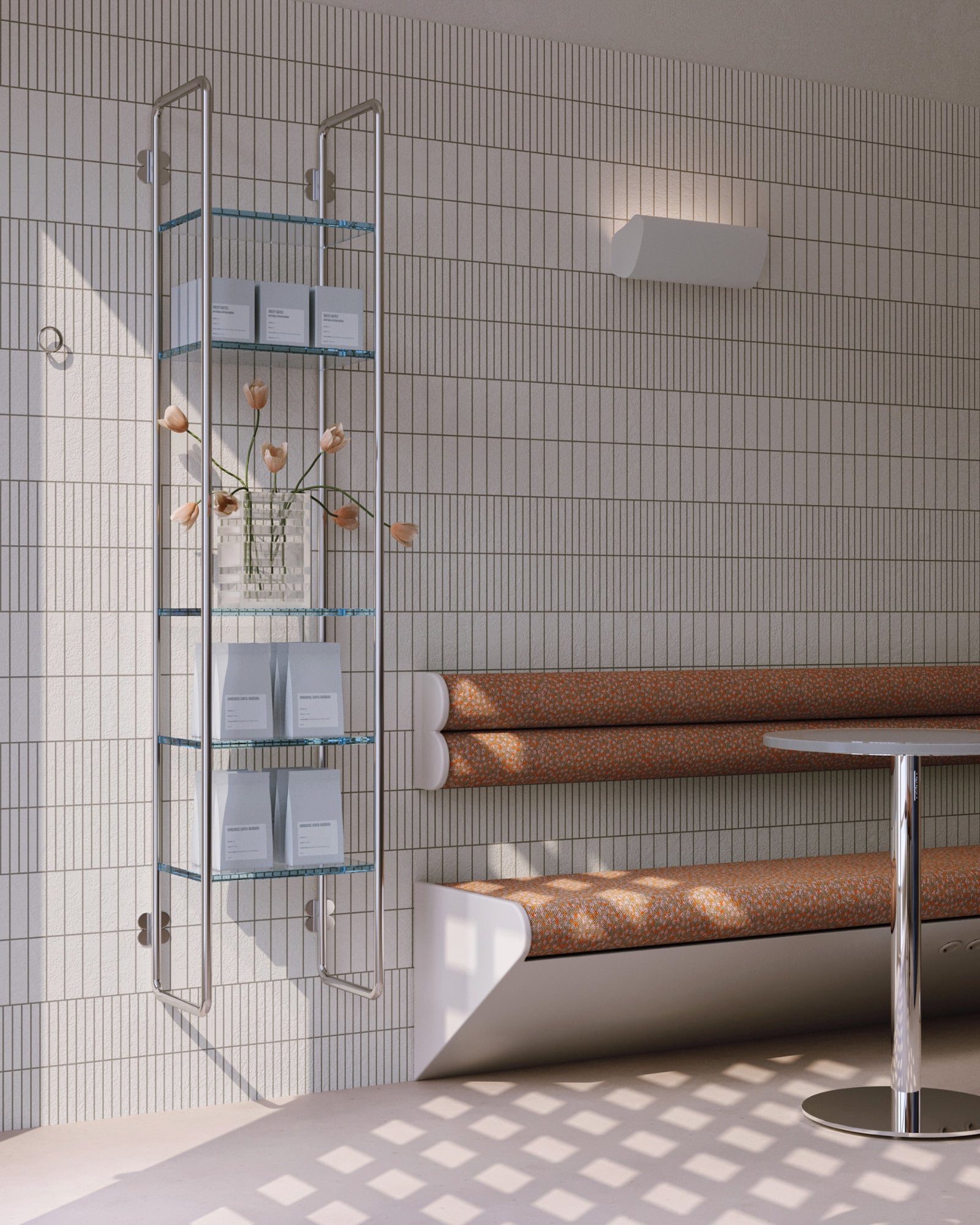 Die wenigen Elemente des Interieurs erzeugen jeweils eigene Stimmungen – durch Texturen, Materialien oder Formen. Die Wandfliesen von Mutina sorgen für ein klares Raster, der Heizkörper von Tubes wirkt wie eine architektonische Skulptur und das Frontfenster wurde durch Glasbausteine ersetzt. So hat Korpaleva einen intimen Raum geschaffen, der sich dem urbanen Standort entzieht, eine zurückhaltende Atmosphäre erzeugt und zugleich maximale Funktionalität bietet.
