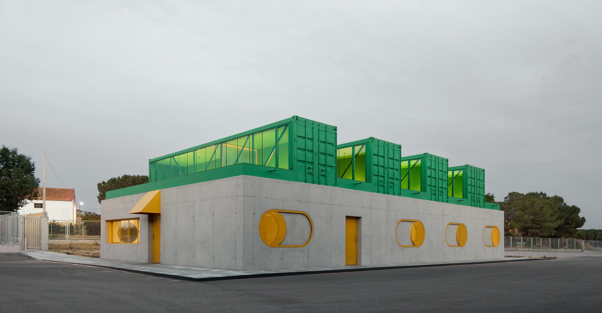 Bauherr ist Agrosemillas, ein Unternehmen mit langer Tradition in der Saatgutproduktion, das sich aktuell in einer Phase der Neuausrichtung hin zu technologischer Innovation und nachhaltiger Entwicklung befindet. Diese Transformation sollte sich auch architektonisch abbilden. Entstanden ist ein eingeschossiger Baukörper mit 280 Quadratmetern Bruttogrundfläche, der zwischen bestehenden Hallen positioniert ist und mit einem Betonsockel formal an die industrielle Umgebung anknüpft. Darüber liegen vier wiederverwendete Überseecontainer – allesamt in Grün gehalten –, deren Anordnung das prägende Element des Entwurfs bildet.